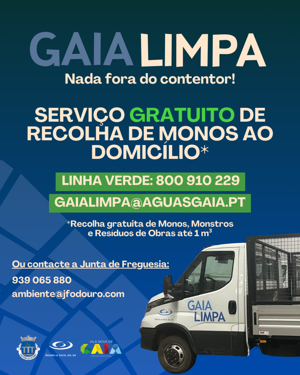 O Projeto Gaia Limpa – Nada Fora do Contentor é um projeto promovido pela Águas de Gaia, EM, SA em parceria com a Câmara Municipal de Gaia e a Junta de Freguesia de Oliveira do Douro, que visa reforçar a limpeza urbana, a sustentabilidade ambiental e a proximidade aos cidadãos da nossa freguesia.